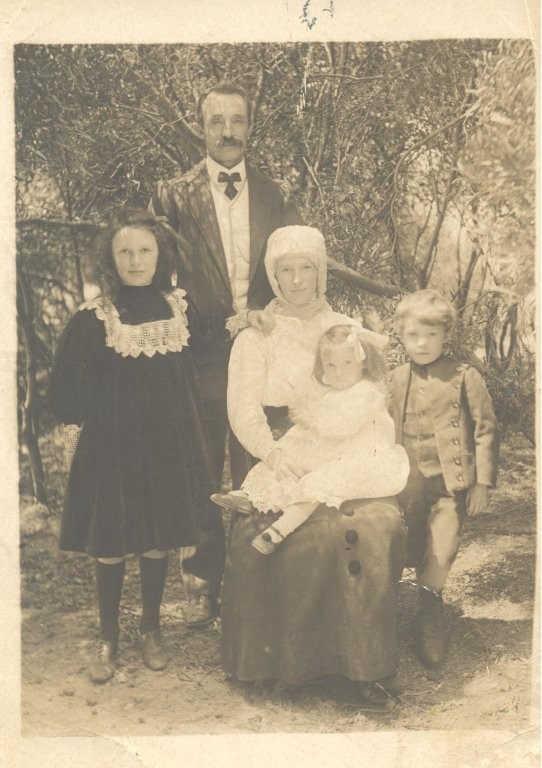 c. 1910B/W Print. Charles Efford with his wife Ruth and children Ivy, Sam and baby Mabel taken in front of light straggly trees. Charles, standing in dappled shade at the back is in a dark suit, light waistcoat, white shirt and dark bow tie. Ruth in dark skirt with large buttons down the front and long-sleeved white blouse and bonnet is sitting in front of him with the baby, Mabel, on her knee. Mabel is in a white frock with a white bow in her hair and slippers with an ankle strap and pom pom. Ivy, standing with her hand on her mother's shoulder, is in a dark, high-necked, long-sleeved frock with a wide square-necked lace collar. She has long dark socks and shoes and a bow in her hair. Sam, standing the other side of his mother, has a light waistcoat buttoned high to the neck and a short, long sleeved jacket. Printed and written on the rear [Ivy EFFORD LEFT, WITH HER PARENTS/ CHARLES + RUTH EFFORD/ MABEL + SAMUEL] and [Mr & Mrs Efford & children/ when a a man broke into our home/ + tried to kill us all at 4am,/ but God saved us all./ Photo taken the next day./ Charles + Ruth Efford/ with Ivy, Mabel (baby) + Samuel].