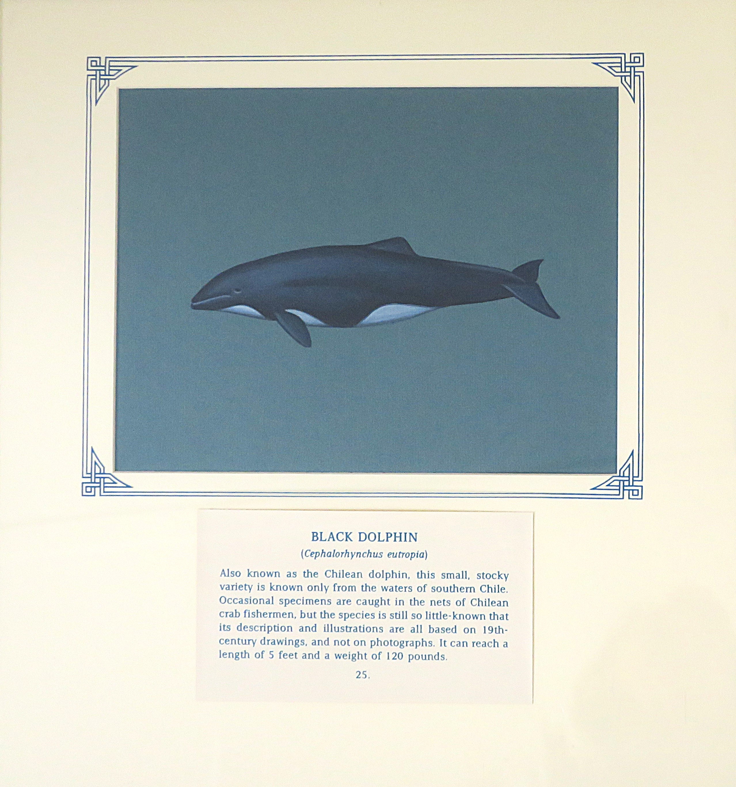 c. 1975Painting of black dolphin with white throat and underbelly, small dorsal fin and rounded head; gouache on blue card, framed and mounted with inscription (25.)