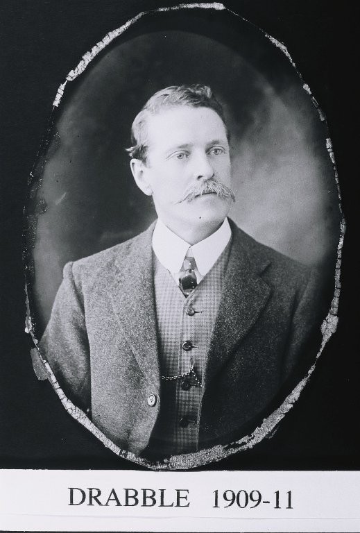 1909 - 19223 x B/W bust portrait photographic prints of Walter Drabble. a) Image shows a younger man, with a full moustache and clean shaven jaw. He is wearing a wool mix jacket with a checked high waistcoat, white stiff collared shirt, spotted tie and a watch chain. Printed beneath [DRABBLE 1909-11]. b) Similar image to A), he is wearing a striped waistcoat, patterned tie. Printed beneath [DRABBLE 1911-12]. c) Image is of an older man, cleanly shaven. The right side of his face and body is in shadow.He is wearing a dark jacket and high buttoned waistcoat, a pocket watch chain, patterned tie and stiff white collar. Printed beneath [DRABBLE 1921-22].