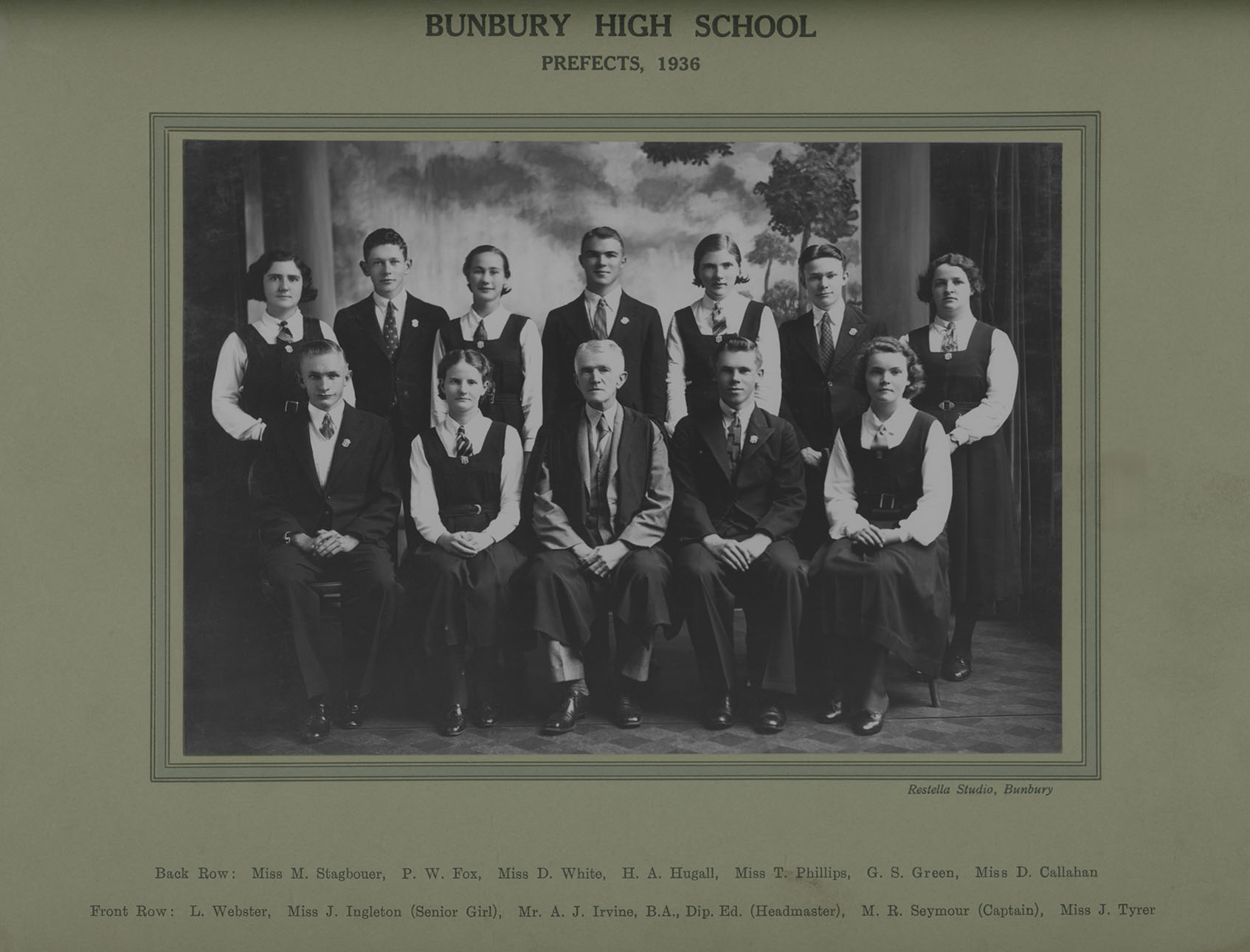 1936Studio portrait of the 1936 Bunbury High School Prefects with headmaster Arthur J Irvine.