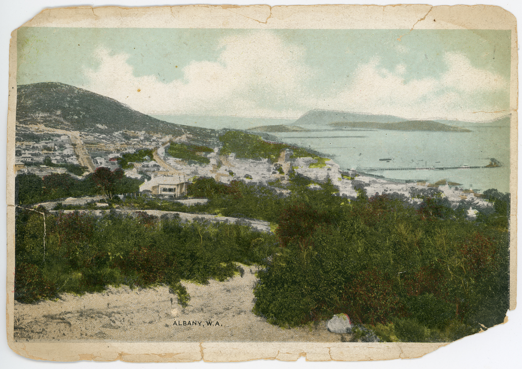 1916Five (5) coloured letter cards of scenic views of Albany, Western Australia including townsite, Middleton Beach, Kalgan River, Dog Rock and Stirling Terrace. There is writing on the back of first two (2) cards with two (2) One Penny postage stamps postmarked ‘Albany 16 February 1916’ 'on the first.