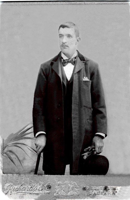 c. 1870B/W Studio portrait of William Merralls. He is wearing an open, three-quarter length coat with contrasting collar over a jacket, waistcoat and white shirt with bow tie. His right hand is resting on a cane and his left holding gloves and a bowler hat. The frond of a parlour palm is on the left, and across the bottom is [Richards & Co] a crest and [49 STURT ST./ BALLARAT].