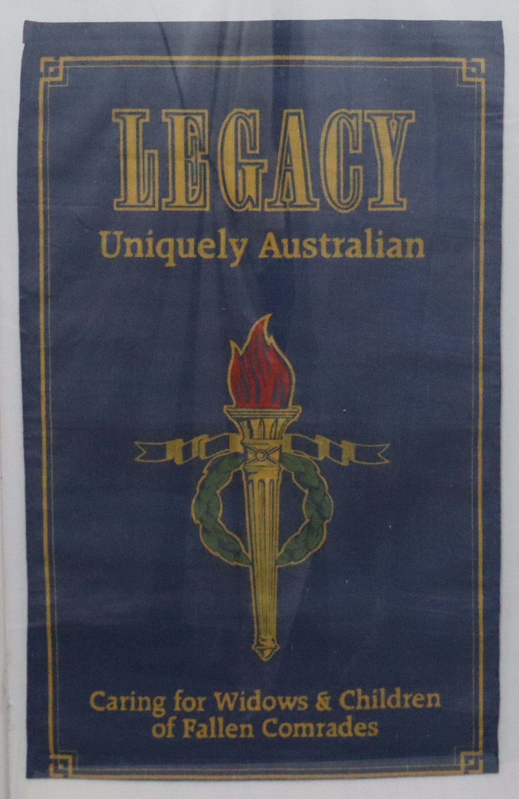 A blue material with a yellow border and print Legacy banner. At the top of the banner in yellow printing is "LEGACY Uniquely Australian". In the centre is a yellow torch with a red flame and green laurel wreath. Below the torch in yellow printing is "Caring for Widows & Children of Fallen Comrades". The banner is hung with two wooden sticks.