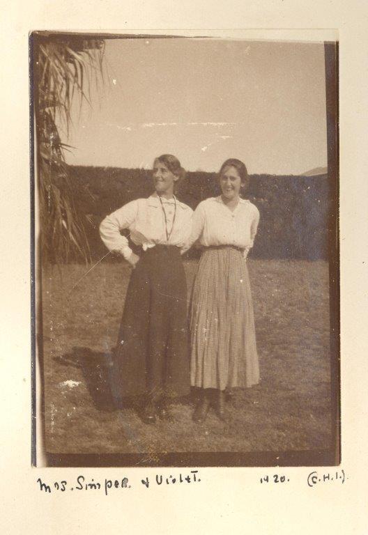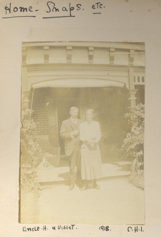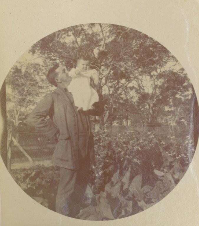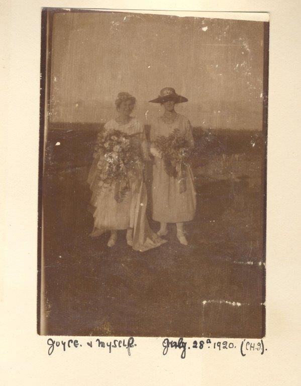 1918 - 1920This photograph includes historic language about mental illness, quoted from a historic source. While we would not use this language ourselves, we have made the decision to retain this language as they are important in representing the attitudes and trends of a particular time in the past. 4 Sepia prints. (a) On a lawned area, Joyce Benson, in ankle length bridal frock with train and holding a large bouquet, is standing next to her bridesmaid, sister Irene, who is wearing an ankle length dress and large hat and is holding a smaller bouquet. Beneath [Joyce & myself. July 28th. 1920 (CHI)]. (b) A man in a three piece suit, shirt and tie standing beside Violet Benson, in skirt and blouse, at the entrance to the medical officer's home at the mental hospital. Above [Home. Snaps etc]. Beneath [Uncle H. & Violet. 1918 C.H.I.]. (c) Two women in skirts and white blouses, standing on lawn beside a large palm. Beneath [ Mrs. Simper & Violet 1920. (C.H.I.)]. (d) A round image of George Joy, in a loose-fitting jacket, holding his baby daughter Ruth on his shoulder. They are in a garden with large trees in the background.
