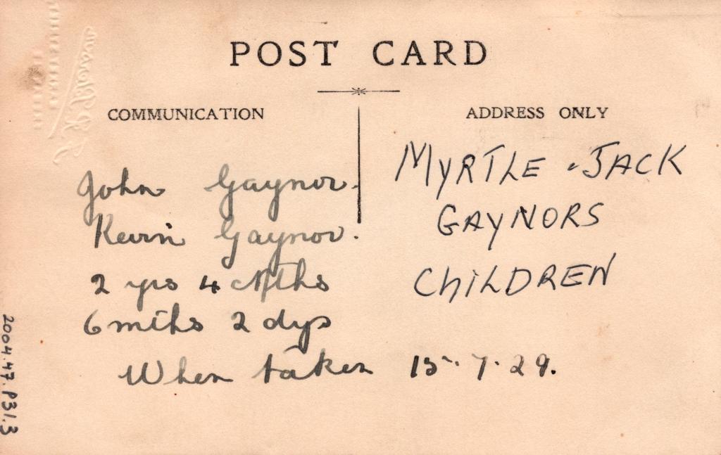 Reverse: Written in black pen 'John Gaynor. Kevin Gaynor. 2 years 4 months 6 months 2 days when taken 13.7.29' and 'MYRTLE & JACK GAYNORS CHILDREN'