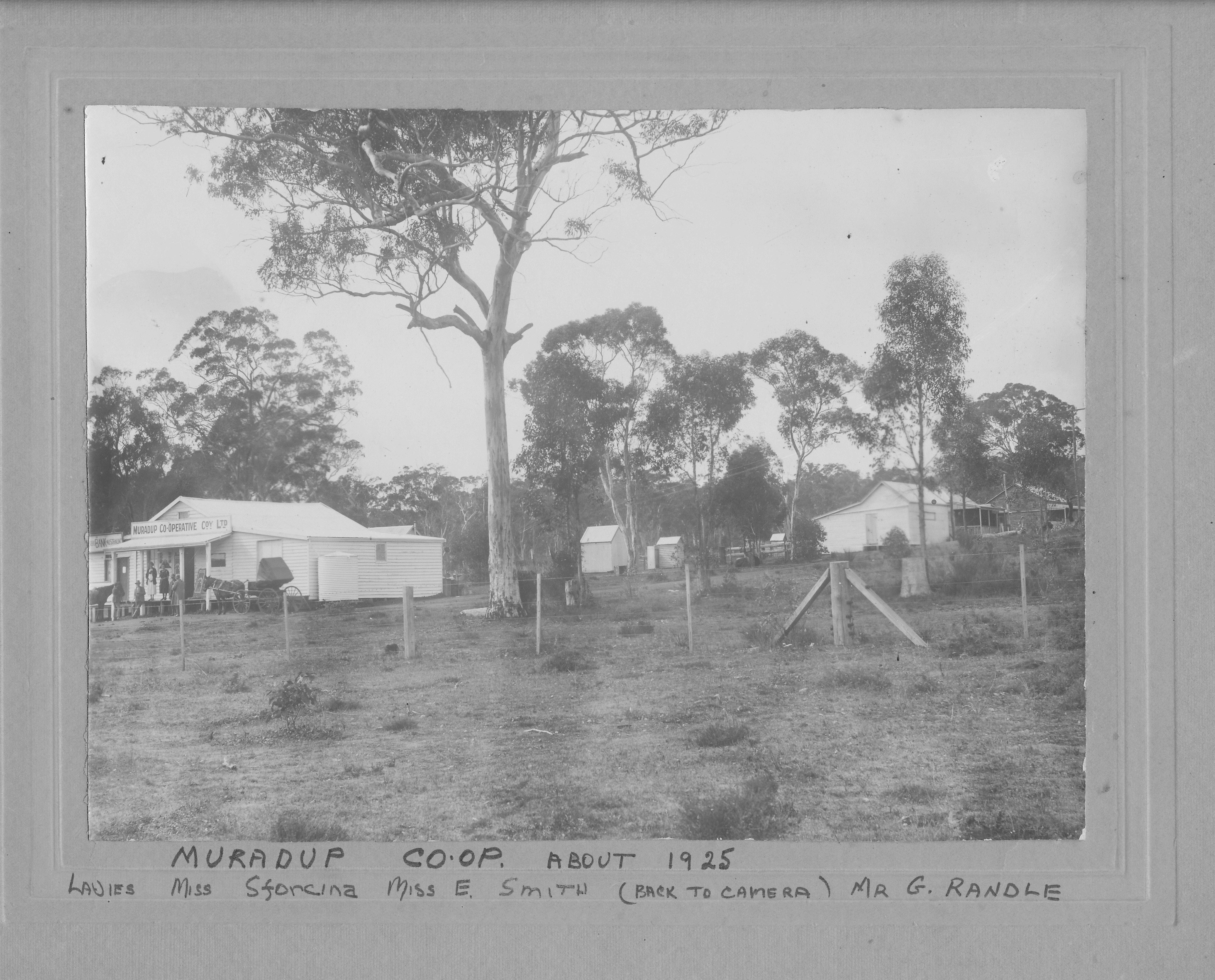 1925Muradup Co-op 1925. Outside the Co-op are Miss Sforcina, Miss E. Smith (Back to camera), Mr G.Randle. Note hooded buggy, rain tank, various little out houses.