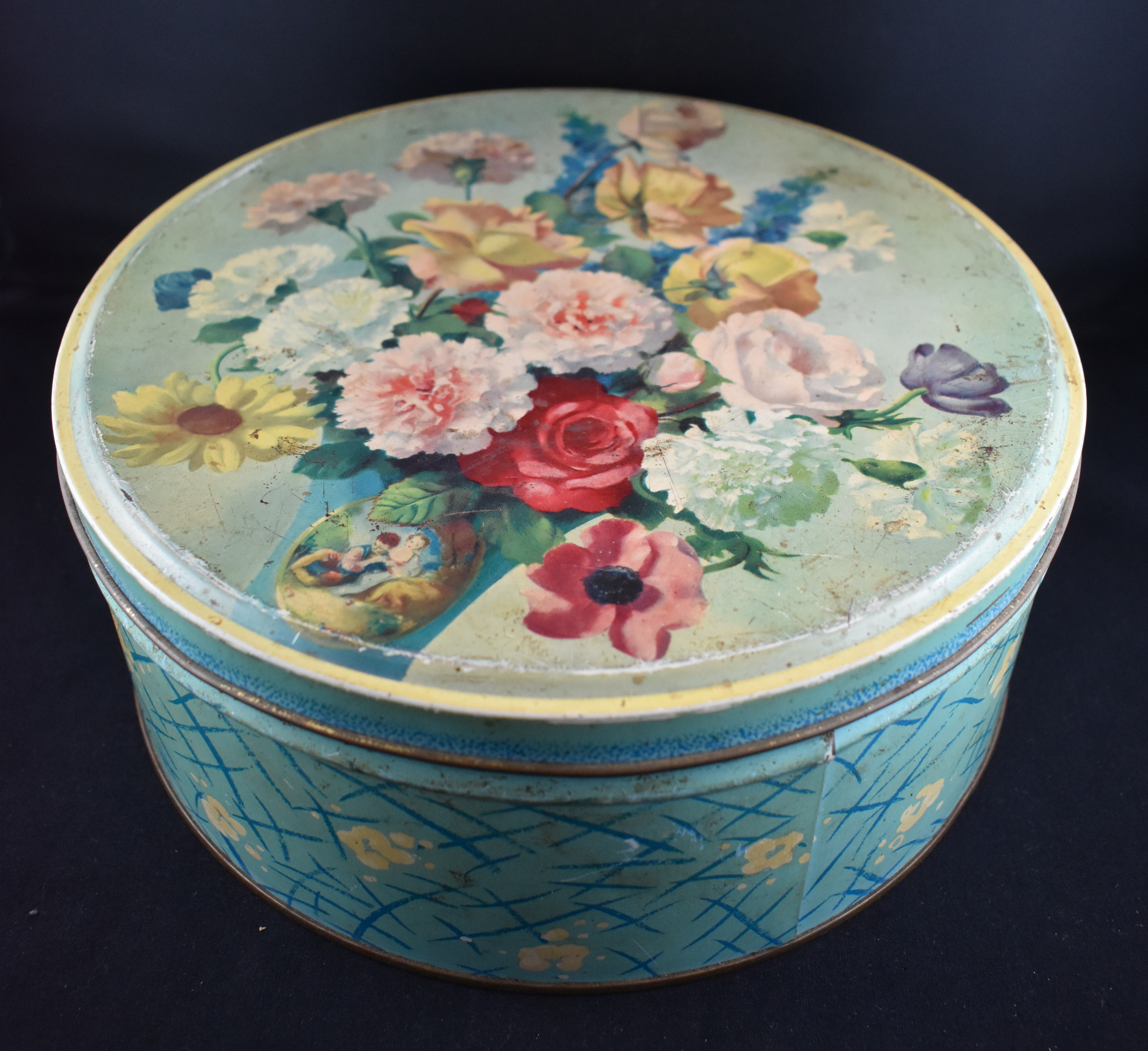 c. 1950Predominantly blue coloured tin decorated with a blue vase of colorful flowers on the lid. The sides are decorated with a stylized wattle pattern in blue and cream. The flowers represented are carnations, poppies, delphiniums, roses and daisies. The tin shows signs of wear including minor dents, scratches and rust.