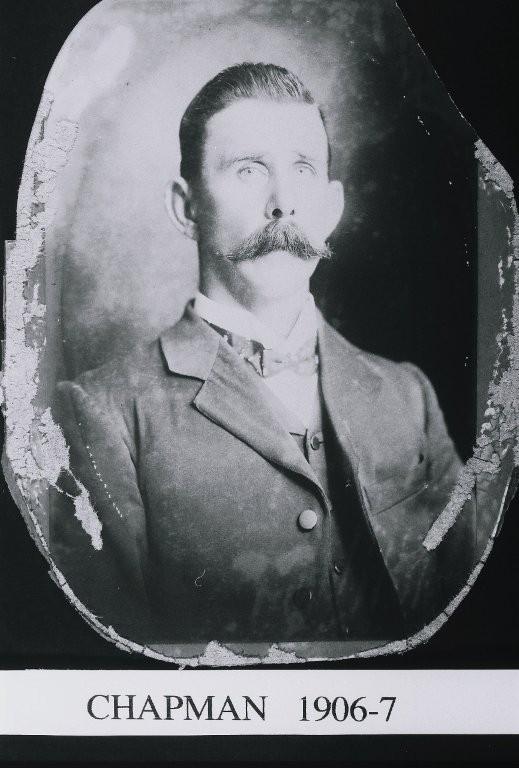 1906 - 19153x B/W Bust portrait photographic prints of R Chapman. (a) Image is of a youngish man with a full moustache and slicked back hair. He is wearing a jacket with collared waistcoat, wing collar and patterned bow tie. Printed beneath [CHAPMAN 1906-7]. (b) Similar portrait, he is wearing a high buttoned waistcoat, with matching jacket. There is a pin attached to his jacket pocket. He is wearing a wing collar and checked tie. Printed beneath [ CHAPMAN 1908-9]. (c) Similar to others, he is wearing a checked jacket and waistcoat with a carnation in the lapel, a white tie and stiff collar. Printed beneath [CHAPMAN 1914-15].
