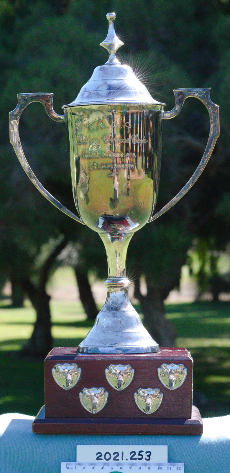 The trophy is a silver plated, two handled cup with lid, mounted on a jarrah wooden base. Winners' names appear on silver crests around the wooden base.