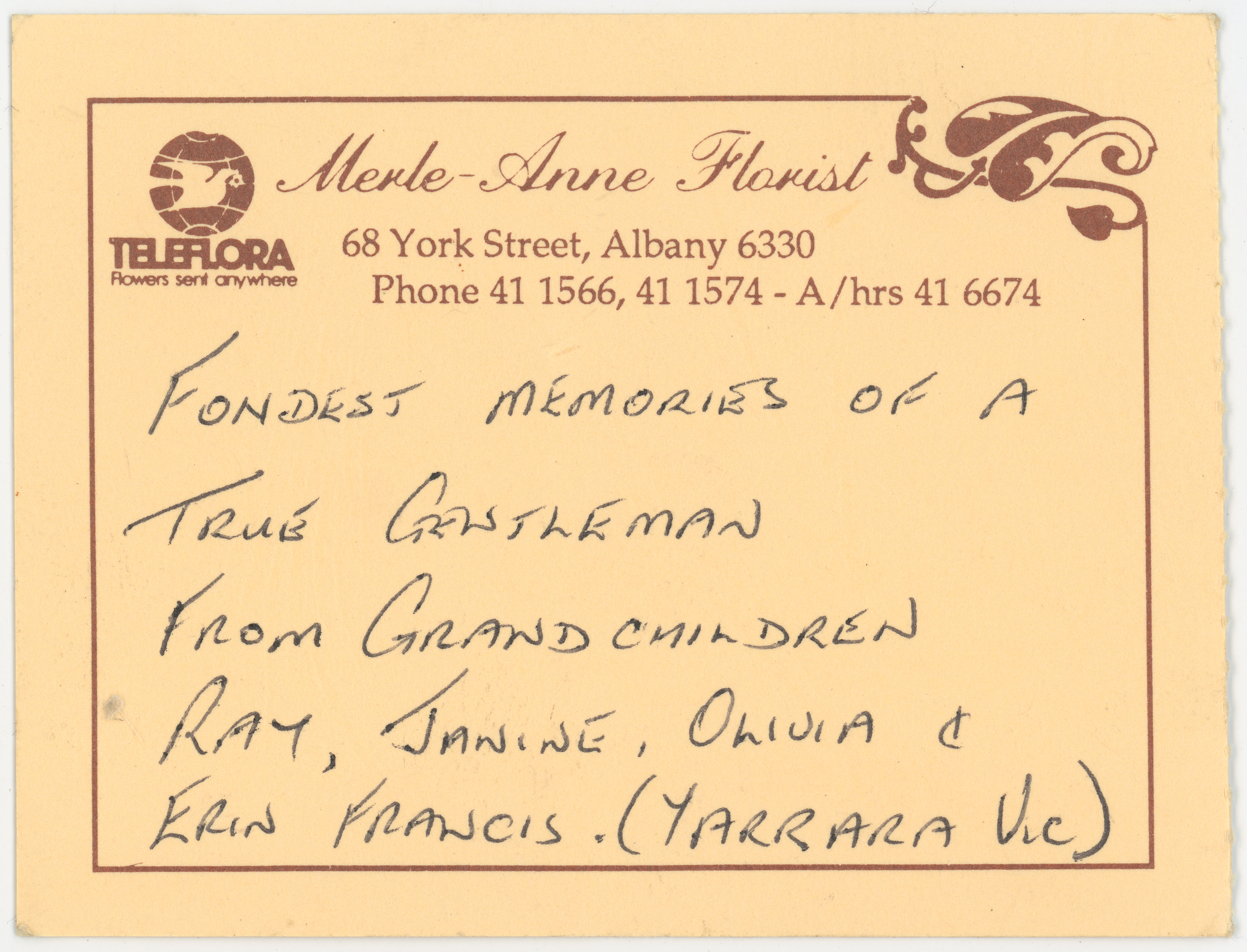 “Merle-Anne Florist / TELEFLORA (flowers sent anywhere) 68 York Street, Albany 6330 / Phone 411566, 416674” printed in ink with “FONDEST MEMORIES OF A / TRUE GENTLEMAN / FROM GRANDCHILDREN / RAY, JANINE, OLIVIA & / ERIN FRANCIS. (YARRARA VIC)” written in black ink.