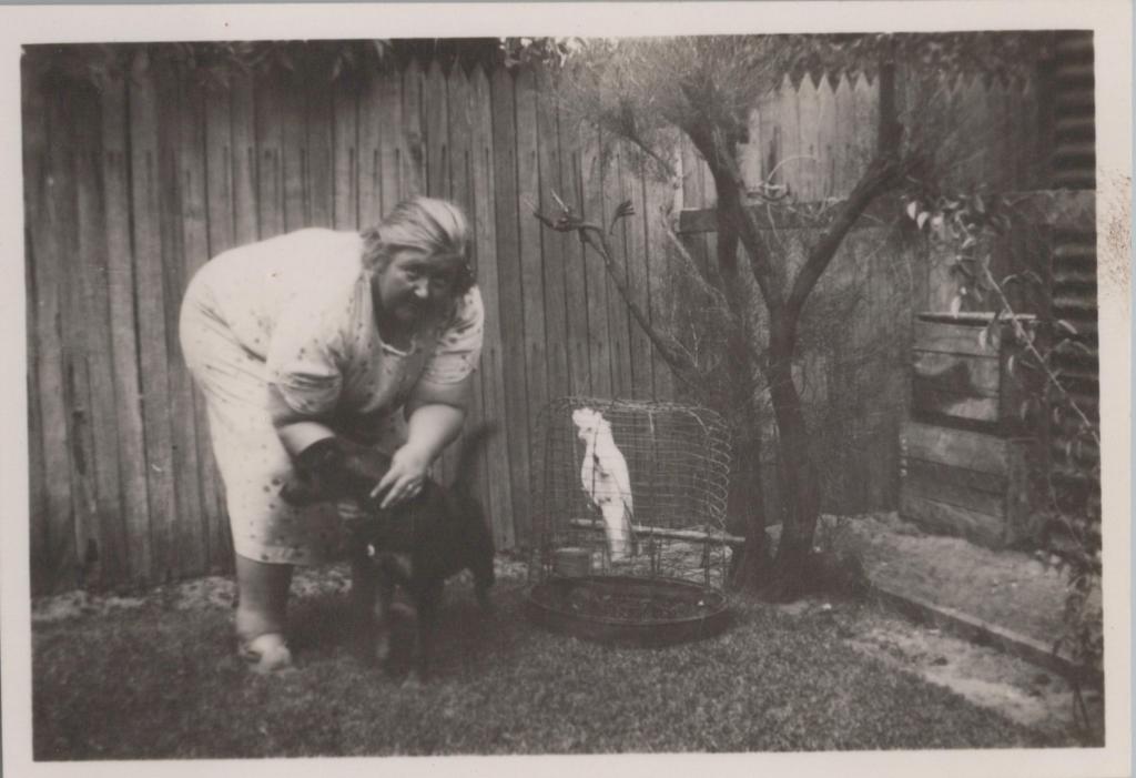 c. 1930Image: A photograph of Pearl Congdon standing on grass, infront of a wooden fence. Pearl is bending over, holding a dark dog, Rover. Next to her is a cage with a white cockatoo inside, 'Cocky Boy' Pearl is wearing a light coloured long sleeve dress. To the right of Pearl is a smasll tree, and what appears to be a wooden building.
