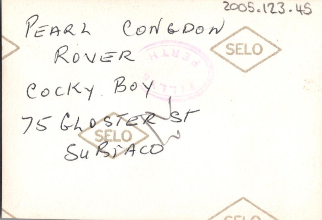 Reverse: Written in black pen is 'PEARL CONGDON', 'ROVER', 'COCKY BOY', '75 GLOSTER ST SUBIACO'. There is a purple stamp, 'TILLYS PERTH'.