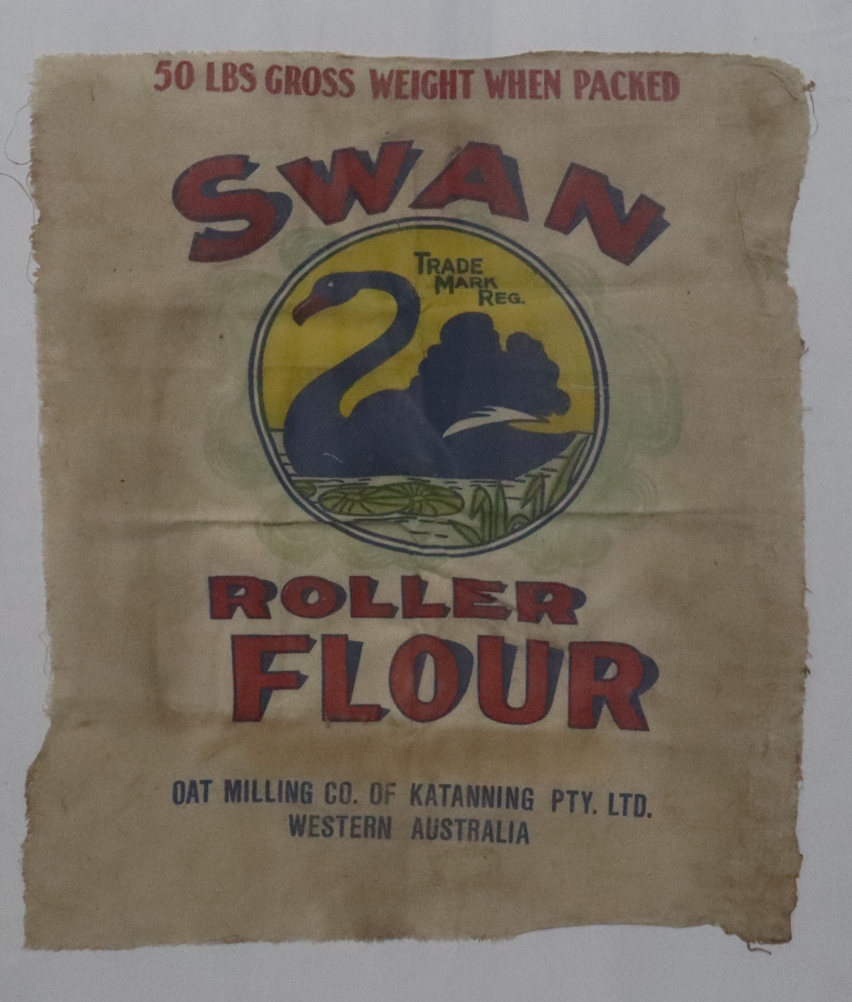 Underneath the circle in red stamped lettering is "ROLLER FLOUR" and underneath this in black stamped lettering is "OAT MILLING CO. OF KATANNING PTY LTD" and underneath is "WESTERN AUSTRLIA".