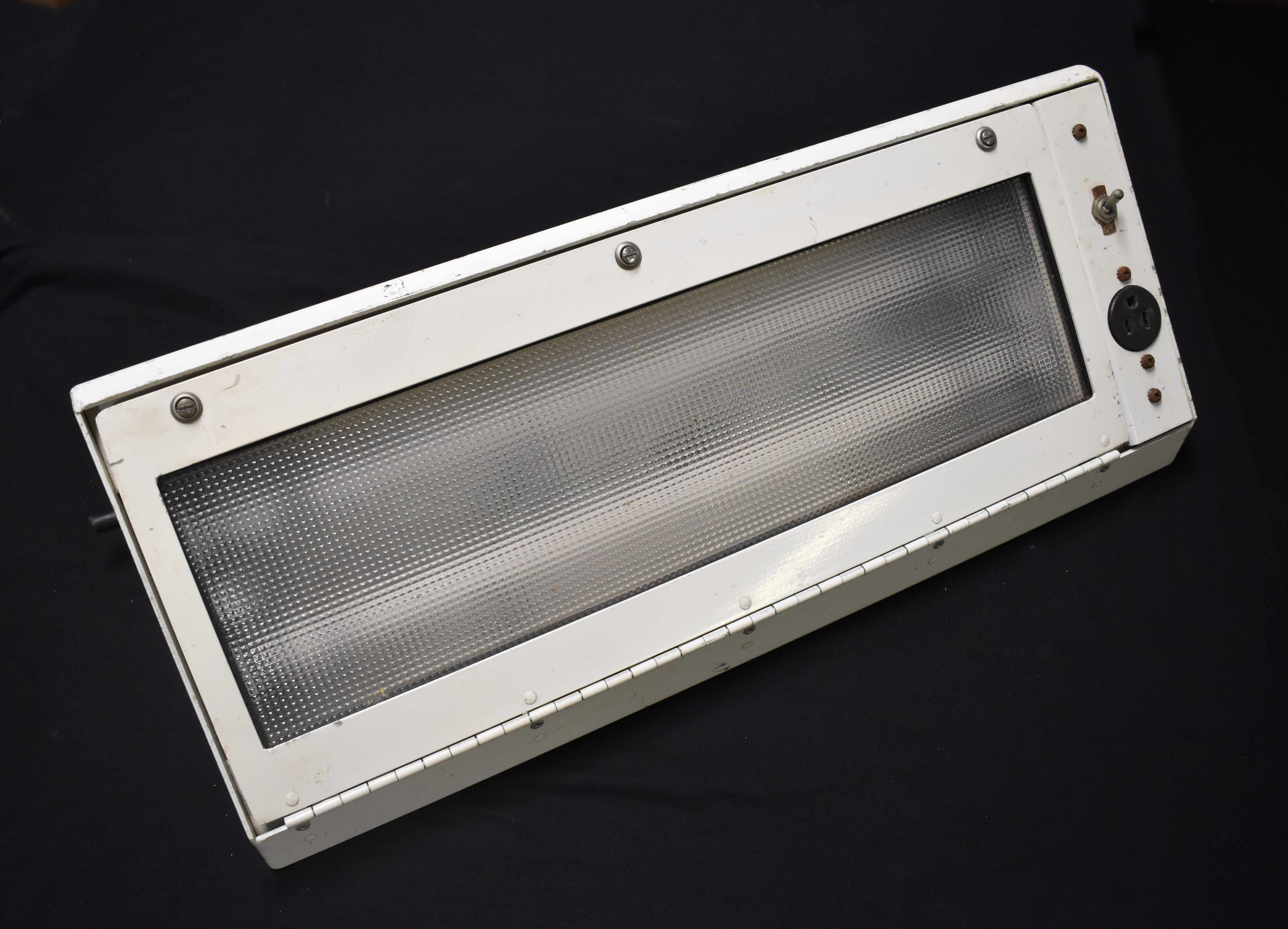 c. 1990Triangular white box with a hinged defused perspex panel secured by three (3) screw at top. Light switch on righthand side with power point socket located beneath. Cord attachment with small section of power cord located at top. The top also has three(3) tan plastic fixings. A small red rectangular label with white text is fixed by adhesive on the right edge. On the back are six (6) fixing holes.