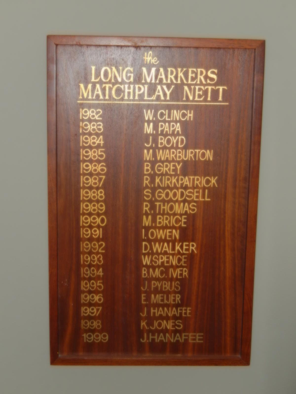1982 - 1999This Honour Board recognises the winners of the Men's Long Markers' Match Play Championship from 1982 to 1999.