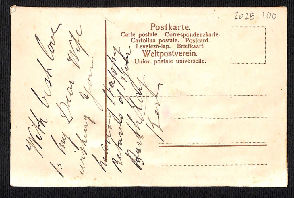 The reverse has a cursive message written arcross the short length which reads: 'With best love / to my Dear Wife / wishing you / many Happy / Returns of yout / Birthday / Ken(?)'. Along the top long edge is the word Poste card written in a bunch of different languages.