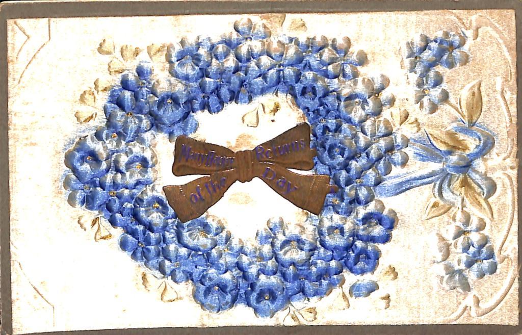 Horizontal postcard with a blue embossed floral wreath in the centre. Thdere is a golden embossed bow in the middle of the wreath which reads 'Many Happy / Returns / of the / Day' across it. The background is a shimmery cream colour with some decorative embossing neat the corners. There is a thin dark grey border around the edge.