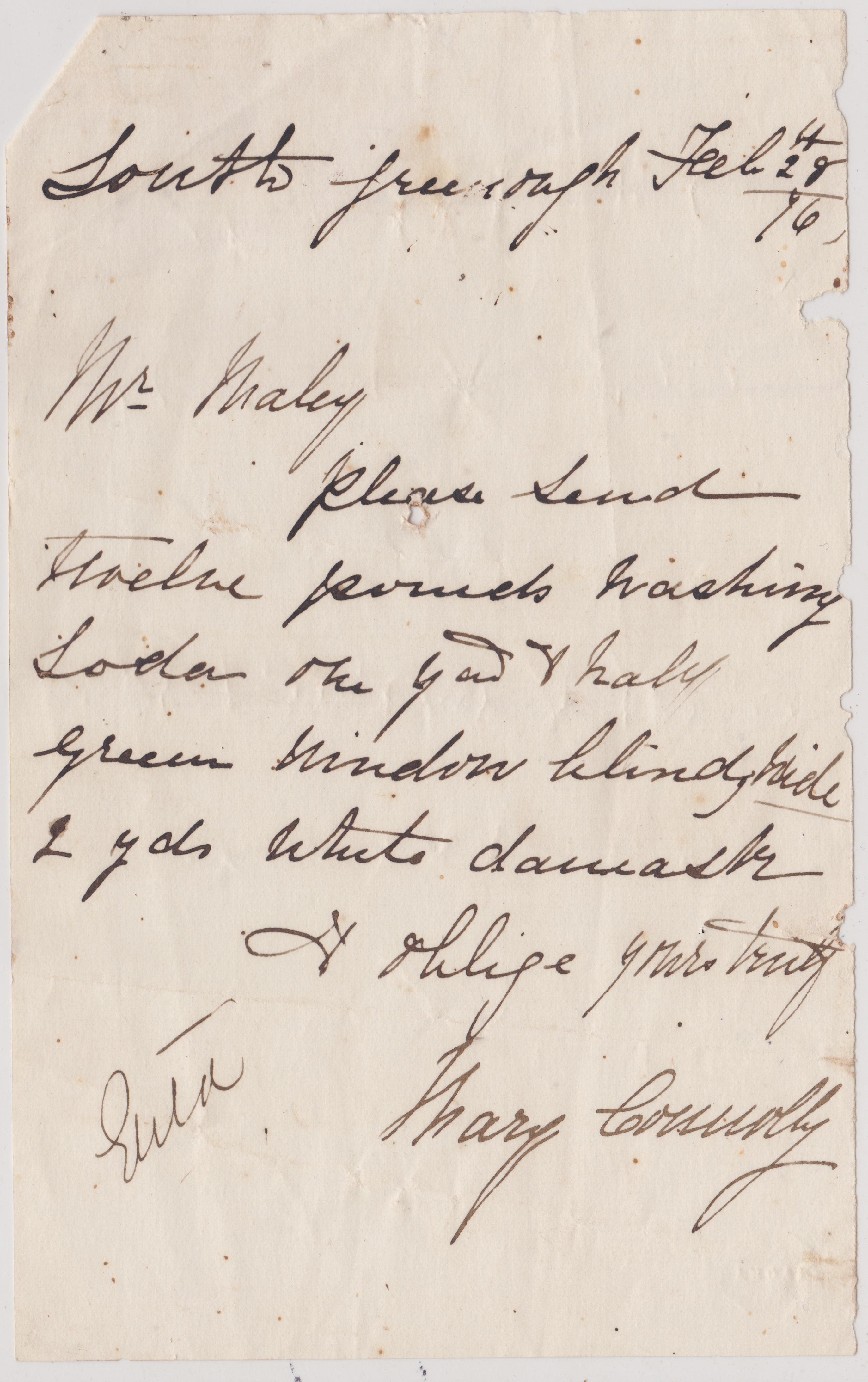 Mr Maley please send twelve pounds washing soda one yard & half green window blind wide 2 yds white damask & oblige yours truly