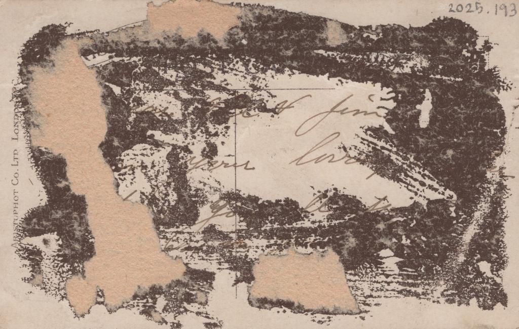 The reverse appears to have been previosuly pasted (perhaps into an album). The remaning card obscures majority of the surface, including the handwritten message. The words which can be made out are 'Jim' / ' your love'. Presumably sent my Mr Jim Dennis, perhaps to his wife Lillian Dennis for their wedding.
