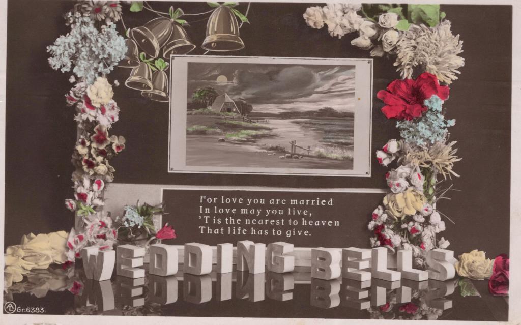 1900 - 1960Horizontal postcard with a black background and thin white border. At the bottom in grayscale three-dimensional block lettering, with a reflected shadow, reads: 'WEDDING BELLS'. Extending upward from either end are two collumns of multi-coloured flowers. Between these is a landscape grayscaleimage of a lake-side cabin under the clouded moonlight. The flora in the image has been colourised in green. The image has a white border. Next to the top left corner of the iomafe is six cartoon bells with green bows.