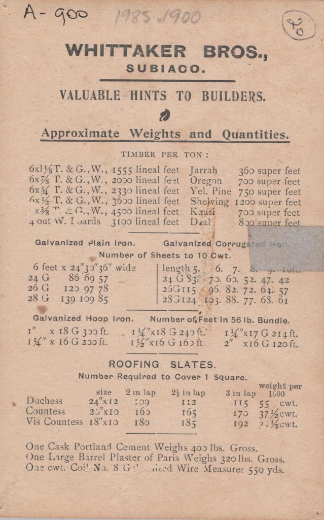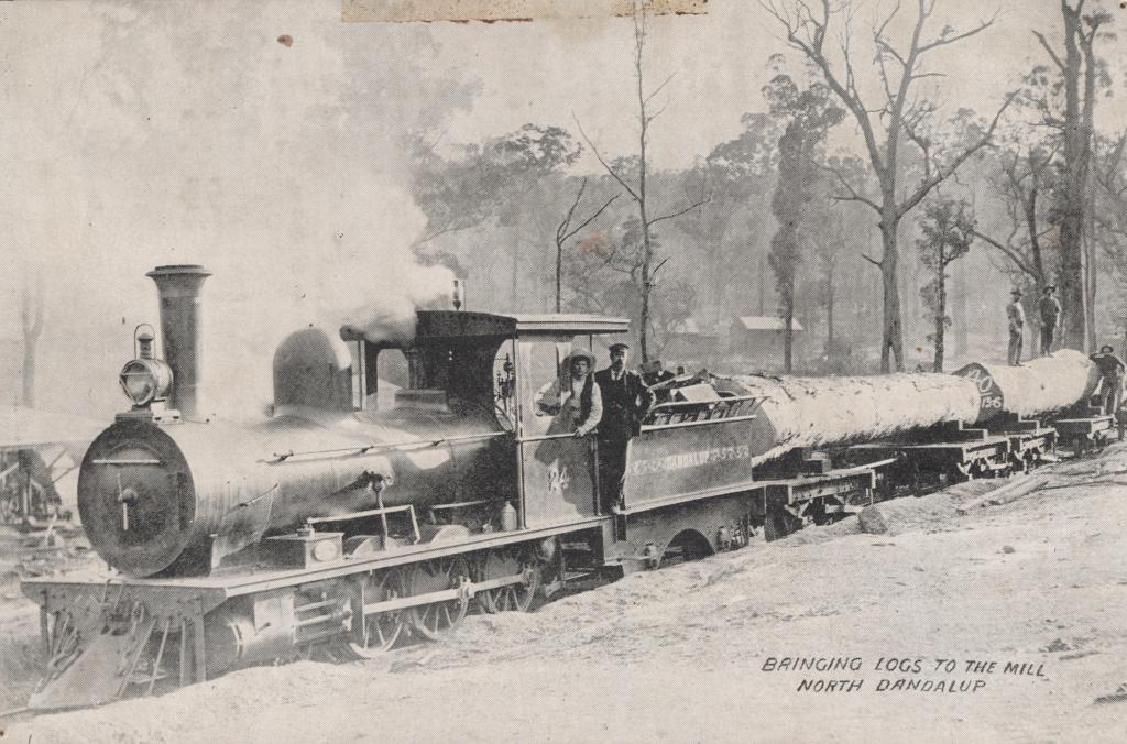 1920Black and white landscape postcard. Showing the Dandalup train which brought logs to the mill. There are two railway workers standing at the opening of the steam engine. The words 'Bringing Logs to the Mill, North Dandalup' are printed at the right bottom corner. On the reverse is a chart titled 'Valuable Hints to Builders' produced by Whittaker Bros. which gives details of weights and quantities of their products.