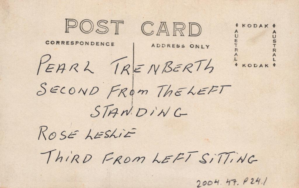 Reverse: Written in black pen 'PEARL TRENBERTH SECOND FROM THE LEFT STANDING ROSE LESLIE THIRD FROM LEFT SITTING'