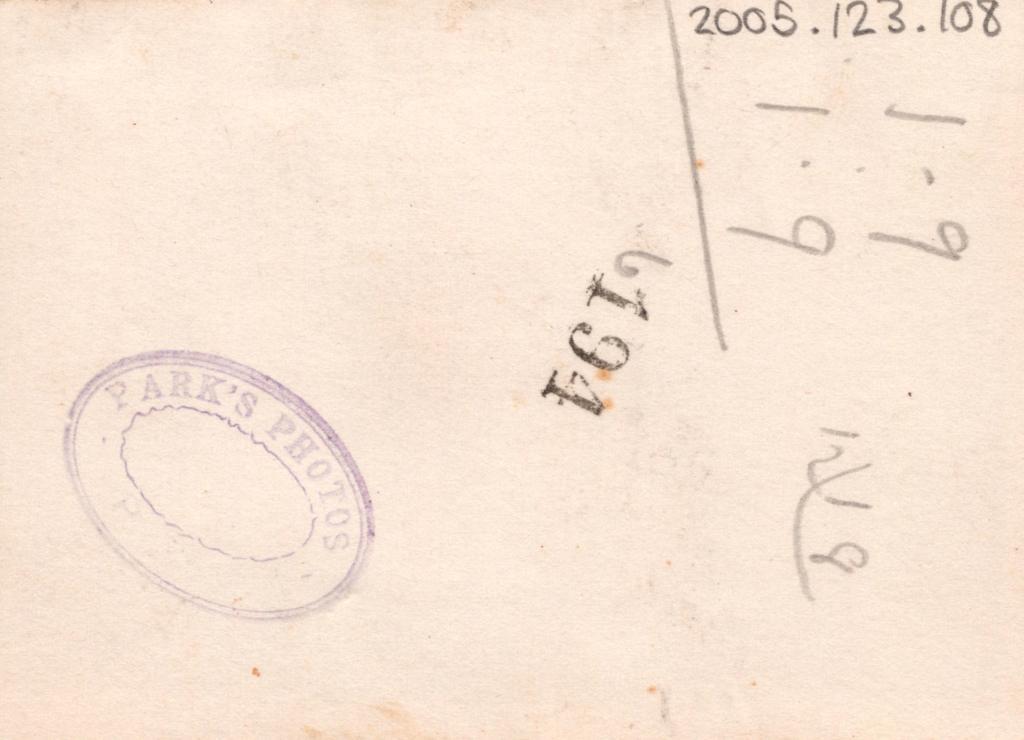 Reverse: Stamped in black ink, '194'. There is a stamp in purple ink, 'PARK'S PHOTOS'