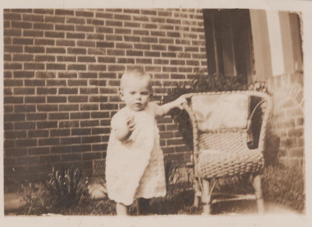 c. 1910Image: A black and white photograph, of a small child standing up, holding onto the armrest of an outdoor chair. The child wears a white outfit, similar in style to a dress. Behind the child there is a small garden, and behind this stands a brick wall, of what appears to be a house.