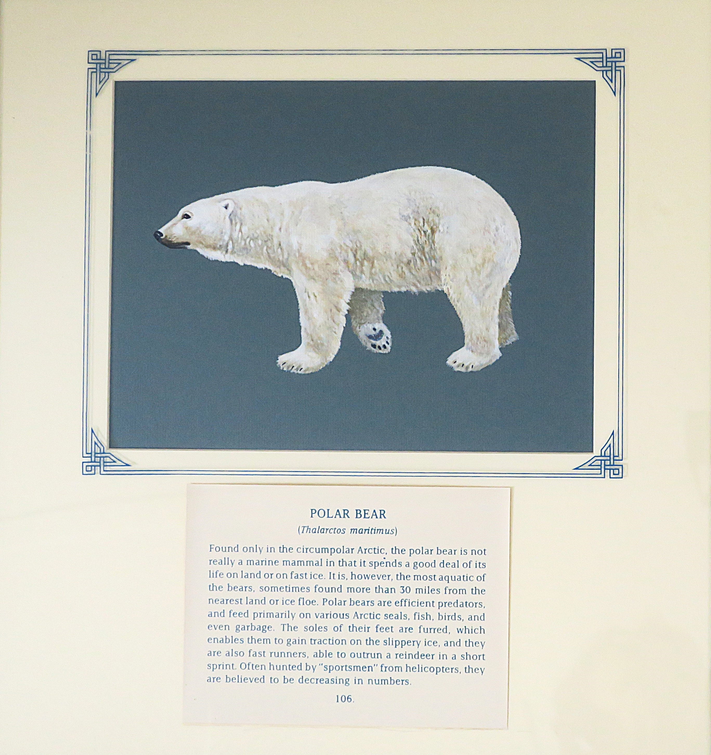 Found only in the circumpolar Arctic, the polar bear is not really a marine mammal i that it spends a good deal of its life on land or on fast ice. It is, however , the most aquatic of the bears, sometimes found more than 30 miles from the nearest land or ice floe. Polar bears are efficient predators, and fee primarily on various Arctic seals, fish, birds, and even garbage. The soles of their feet are furred, which enables them to gain traction on the slippery ice, and they are also fast runners, able to outrun a reindeer in a short sprint. Often hunted by "sportsmen" from helicopters, they are believed to be decreasing in numbers.