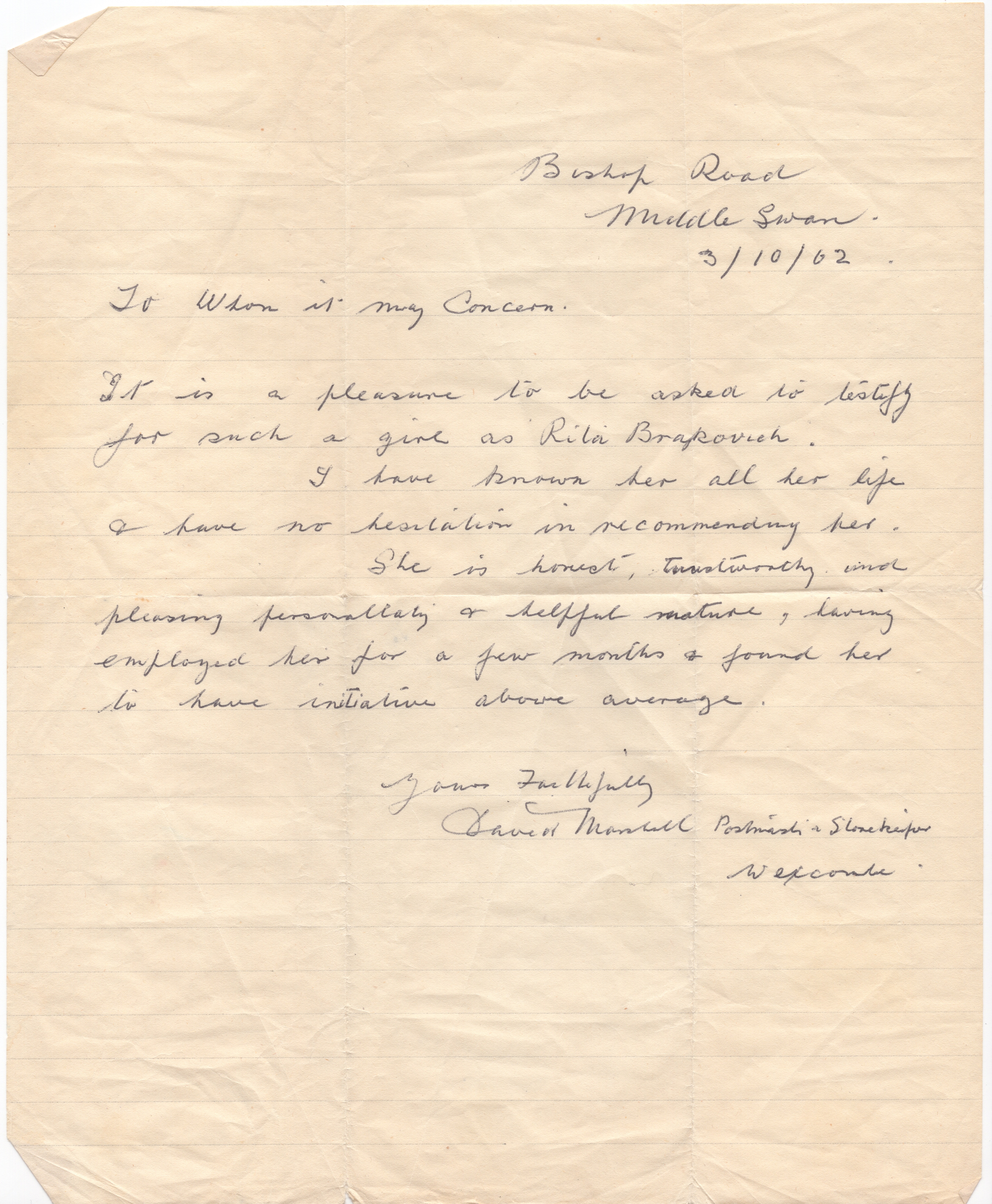 Letter was written for and retained by Rita Brajkovich until donation to Midland and Districts Historical Society.