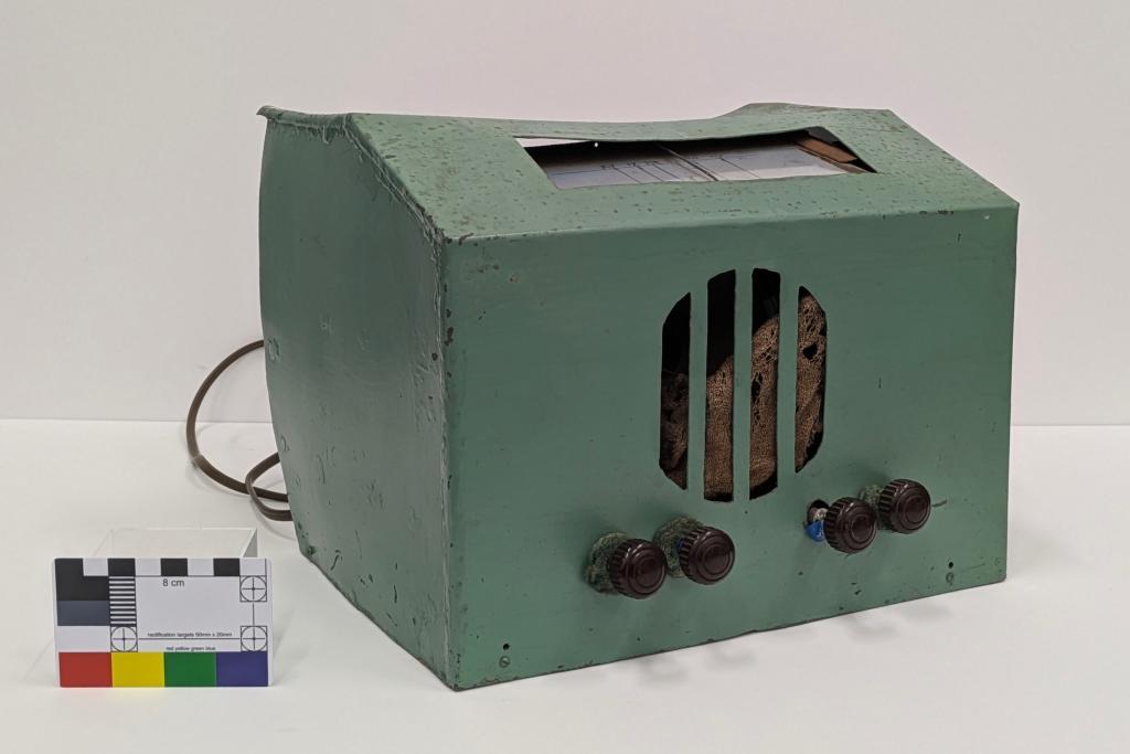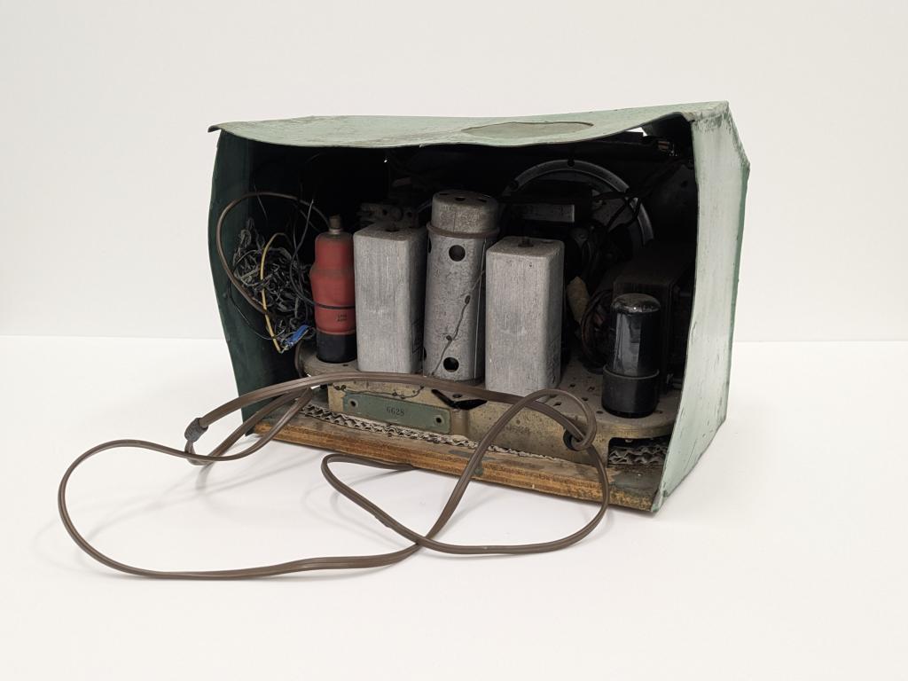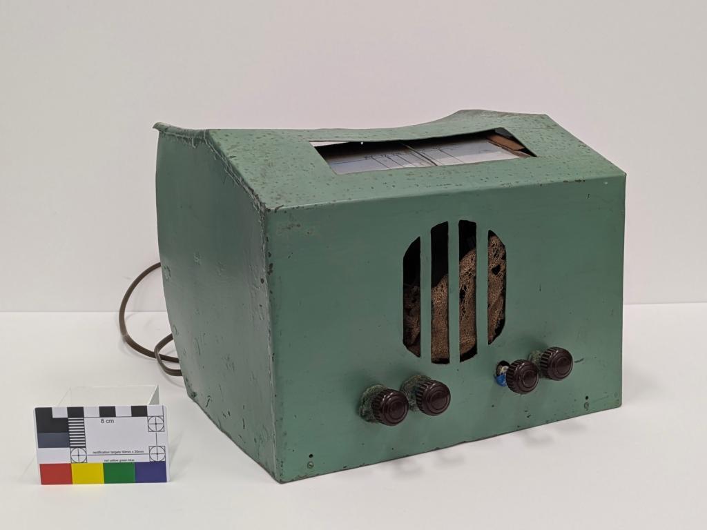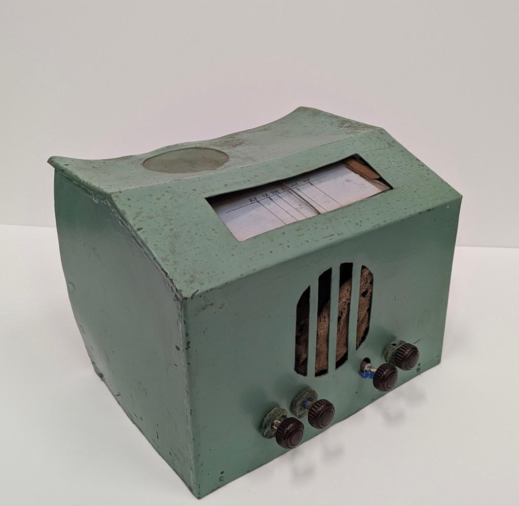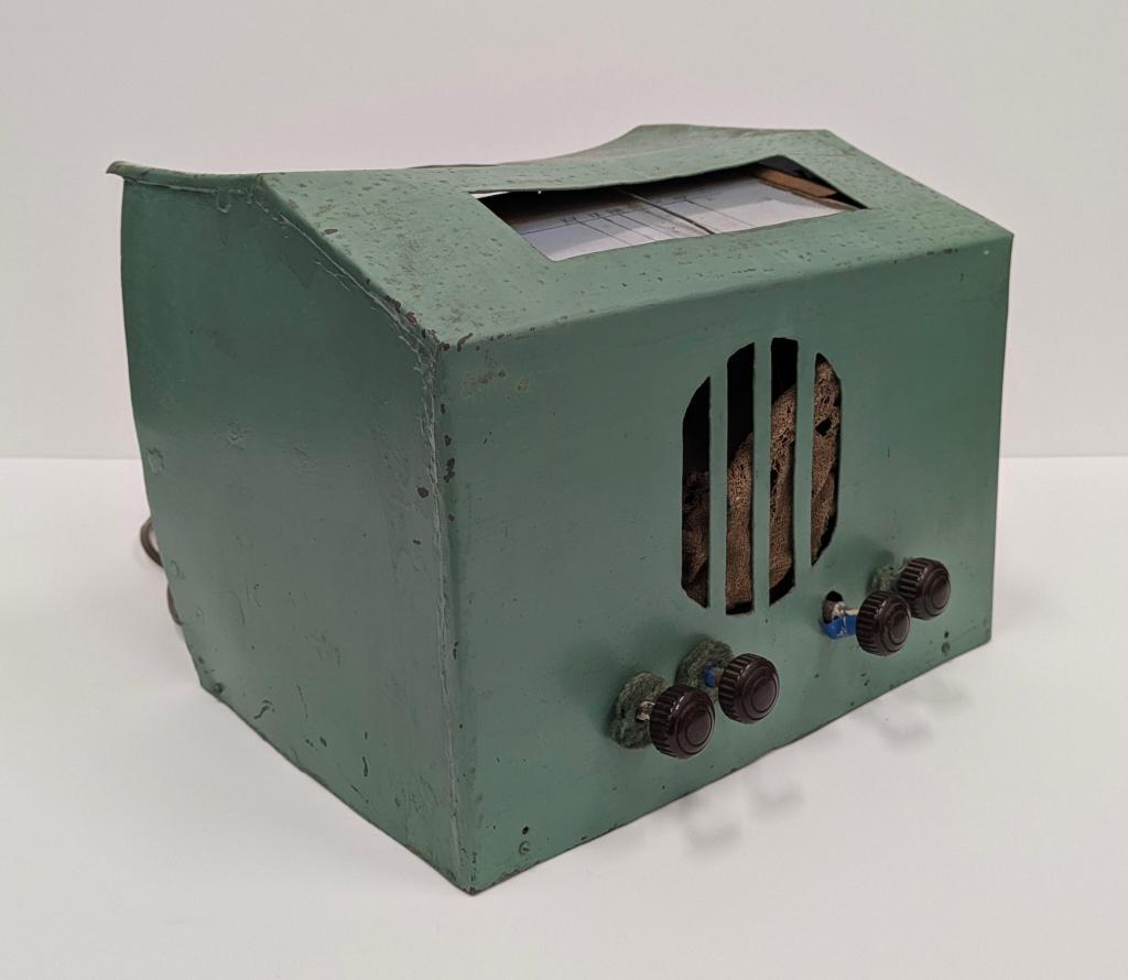 c. 1943Home-made radio or wireless made c1943 by Bert Congdon. Green painted metal casing open at back revealing 3 valves, power transformer and brown power cord. 4 dark red/brown bakelite knobs and 4 openings for sound on front of casing. Top casing has rectangular glass covered opening marked with stations KY, IX, PM, HR, WN, WF. Circular gauze-covered opening at rear of top casing.