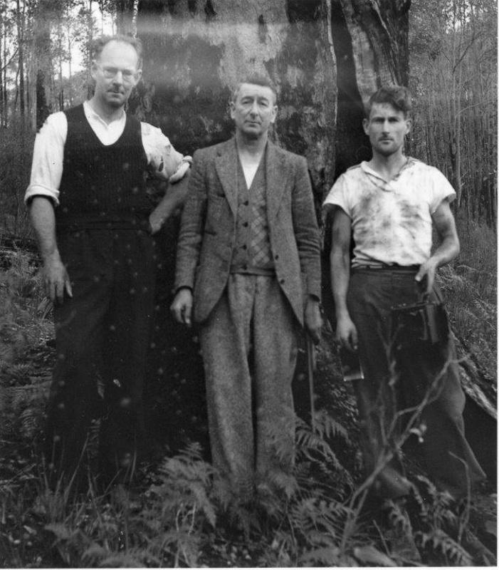 1949Taken at Flyrock, 1949, where Nannup Coal Mining syndicate pegged lease. Geologist unknown, Roy Rowe senior, Right Fred Taylor.