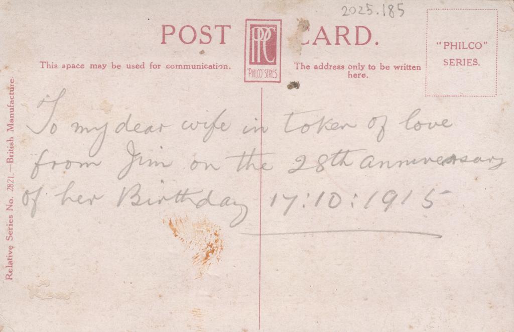 On the reverse there is a handwritten message in grey cursive which reads: 'To my dear wife in token of love / from Jim on the 28th anniversary / of her Birthday 17:10:1915'.