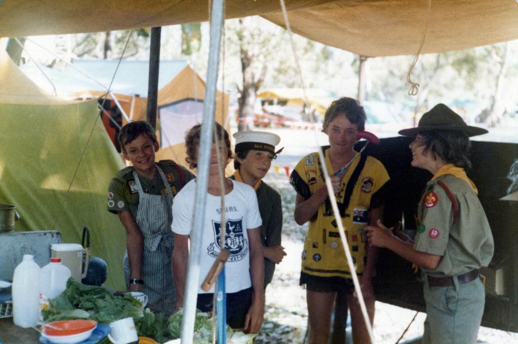 Coloured photograph: Group photograph of five male scouts in camp kitchen. Two scouts are wearing uniform. One scout in a yellow shirt facing the camera has a sausage on pitched fork utensil next to a barbeque. Lettuce, crockery and bottles are on the table in the bottom left corner.