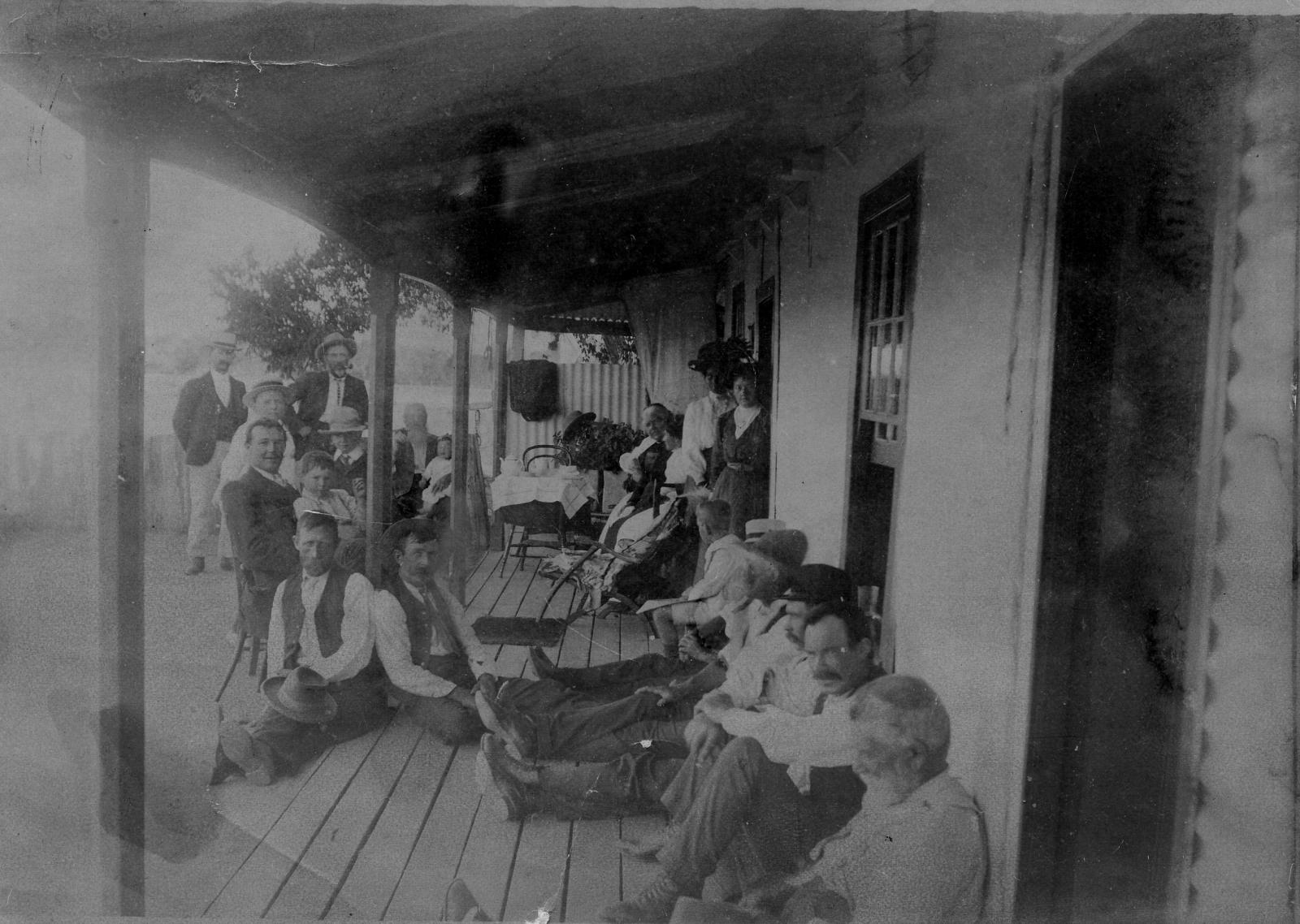 c. 1890Unknown team of Shearers sitting on a verandah following lunch - possibly at Tunney's property. Shearer's were usually fed by the property owner's wife - morning and afternoon teas and a hearty lunch. If shearer's were staying on the property tea was also provided. Some self contained teams may have had their own cook, but most farmers had what was called 'cocky teams' made up of 2-6 shearers and associated shed staff - rousebout, classer and presser. In Kojonup Area most shearing teams were farmers and farmer's son attempting to make money to buy farms, with some Noongar workers trying to survive.