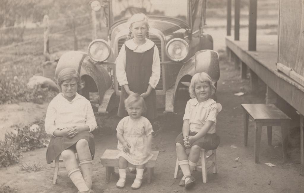 c. 1913Postcard showing Rona and June Price, and Ida and Elsie Wilson. A car is seen behind them.