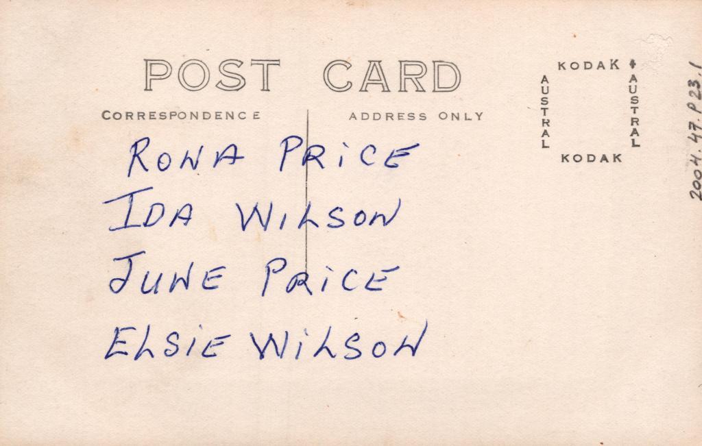 Reverse: Written in blue pen 'RONA PRICE IDA WILSON JUNE PRICE ELSIE WILSON.