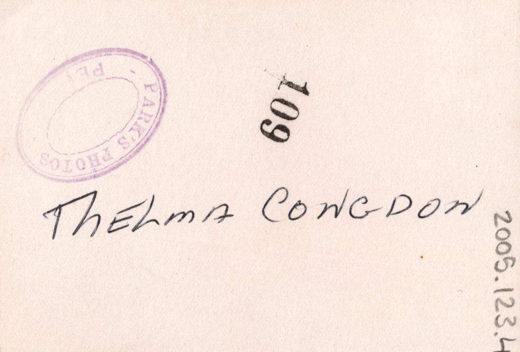Reverse: Handwritten in the middle in black pen ' THELMA CONGDON'. Stamped on the back with a purple oval stamp reading 'PARK'S PHOTO PERTH' and a number '109' in black.