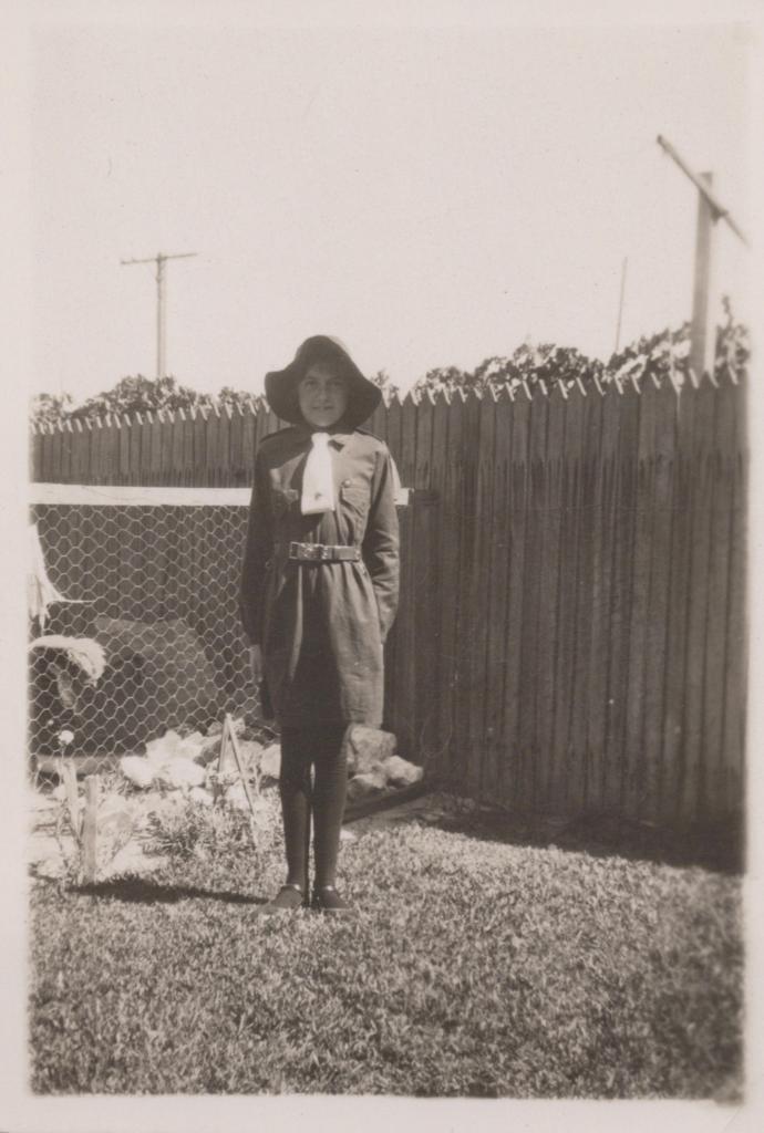 c. 1930Image: A black and white photograph of a young Thelma Congdon standing on grass in front of a wooden fence and a wire fence. She wears a dark coloured dress with a belt and light coloured tie, which may be a uniform. She also wears a dark wide brimmed cloth hat and dark stockings with closed shoes .