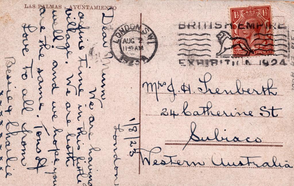 Reverse: Written in black pen is '1/8/23 London' and the text: 'Dear Mum We are having a fine time in this little village. We are both well! and we hope you are the same. Tons of love to all from Bessie & Charlie xxxxxxxx'
