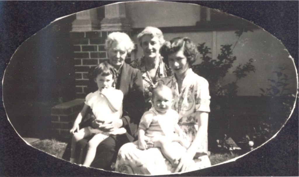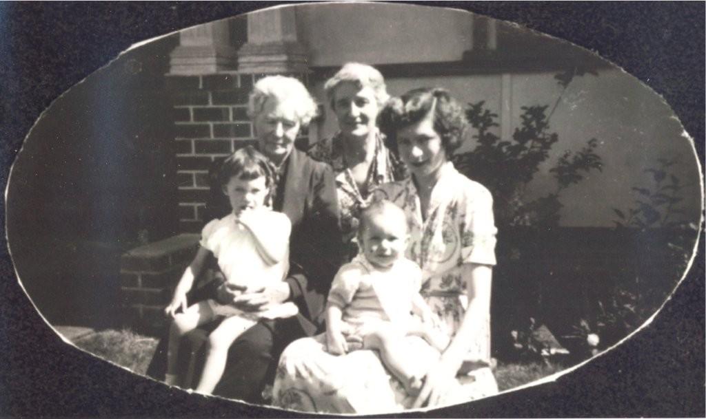 c. 1940 - 1949B/W print. On the left is Ruth Jane Efford, with her daughter Ruth Ivy Robson, grand daughter Sylvia Chidlow and Sylvia's two children Ruth and Teresa . Ruth Jane, with frizzy white hair and wearing a long dark skirt and long-sleeved jacket, is holding her great grand daughter Ruth Chidlow. In the centre is Ruth Ivy with short grey hair and wearing a light frock with collar and revers. Next to Ruth Ivy is her daughter Sylvia who has dark hair with a part, and is dressed in a short-sleeved summer frock and has her baby daughter Teresa on her lap. Sylvia's other daughter, Ruth, is in a short-sleeved summer frock, has dark hair in curls and a fringe. In the background are brick pillars and balustrade to a verandah with shrubs in front of it.