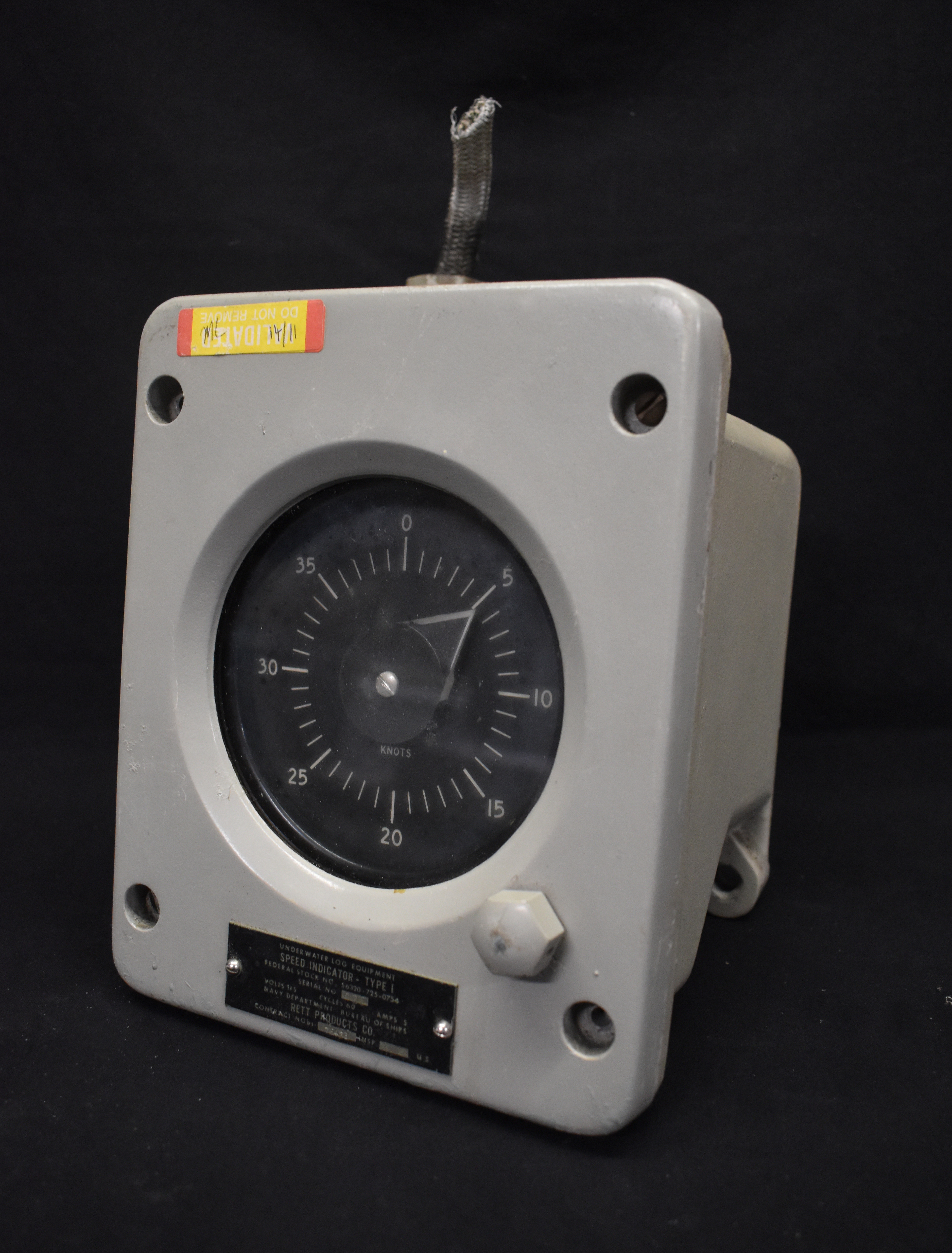 On small plaque on front "UNDER WATER LOG EQUIPMENT / SPEED INDICATOR - TYPE 1" with "SERIAL NO. 426" made by "RETT PRODUCTS CO." with "VALIDATED / DO NOT REMOVE / MC 14/11" adhesive label.