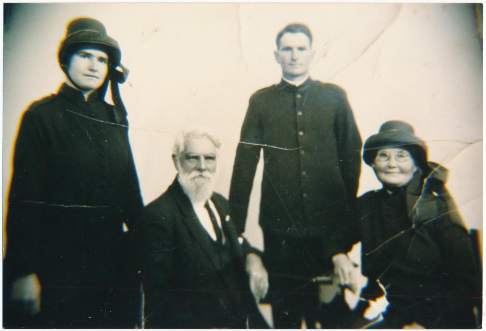 On the back of the photograph handwritten in blue ink is "Left to Right Standing Frances Ruby May & Ernest Arthur Daniels Their Mother & Father Sitting William John (Died 1945) & Mary Ann Daniels" and "before 1945 'Salvation Army'"