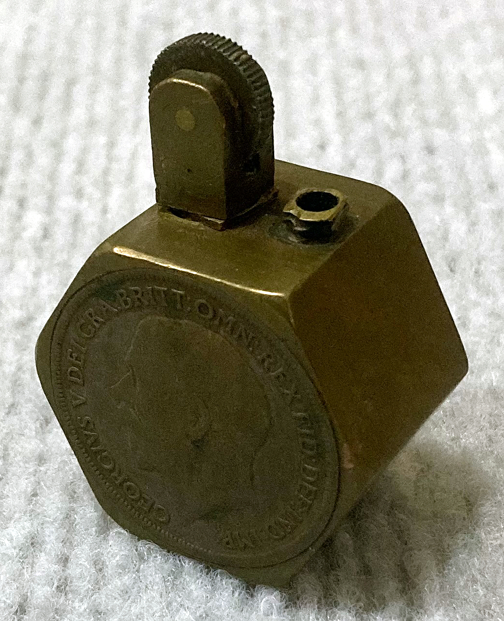 WWI era hexagonal metal cigarette lighter decorated with two coins