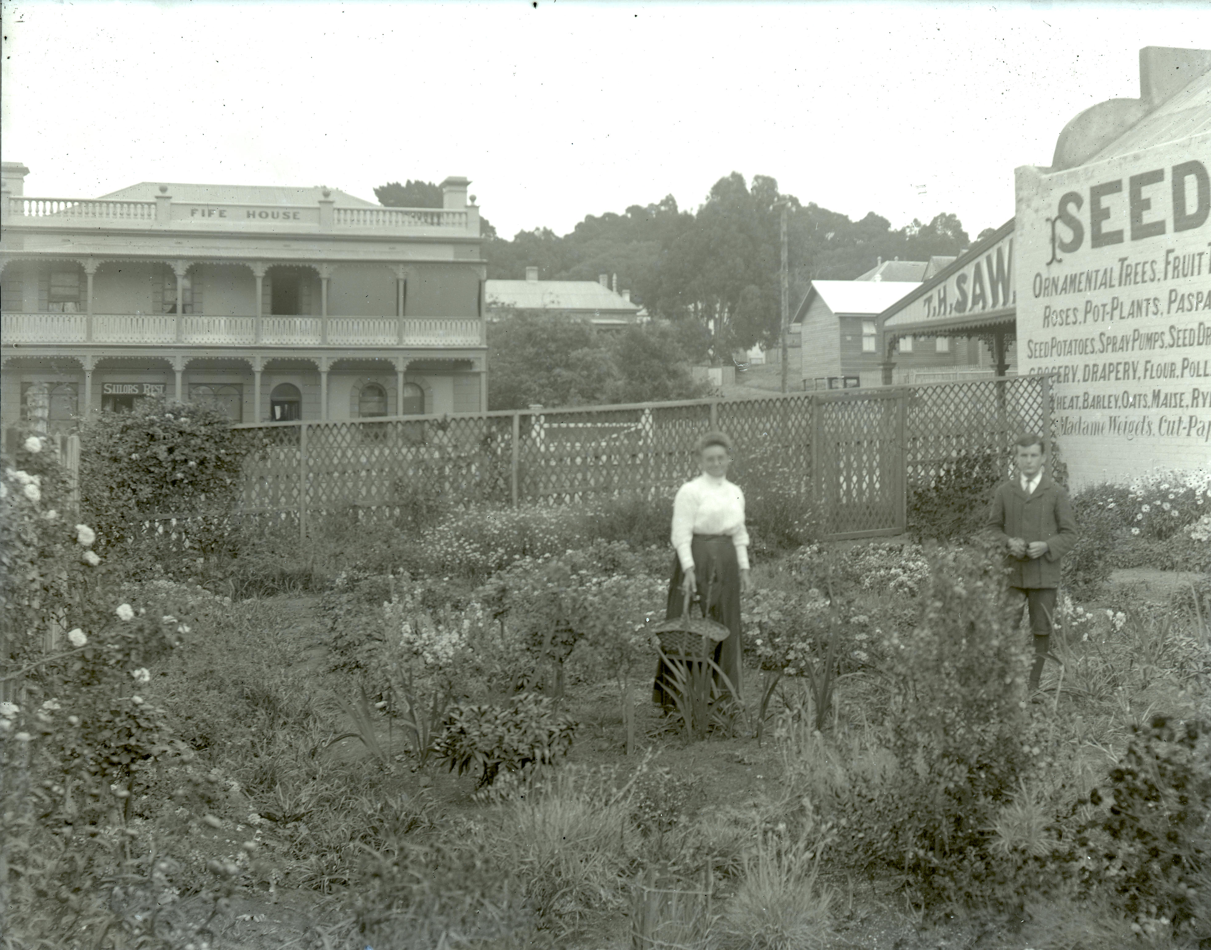 1908A black and white image taken from a glass plate from the collection of armature photographer Bert Saw. It shows his mother and his brother Clarrie standing in her garden next to the central York St store. Fife House and the Government School lot are opposite in the background.