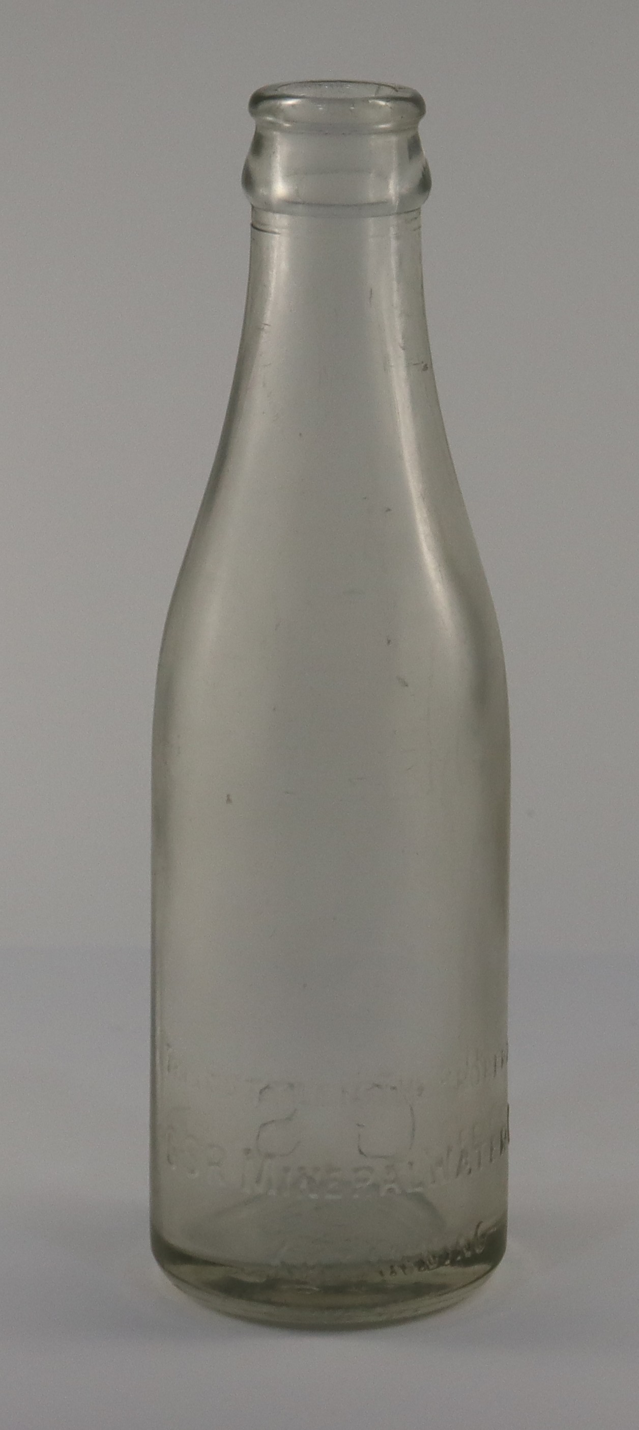 A glass bottle used by the Great Southern railway Mineral Water Co Ltd, the bottle is branded with their name. The Cordial Factory was in Katanning starting in Austral Terrace and later in Conroy street. The cordial factory was early industry.