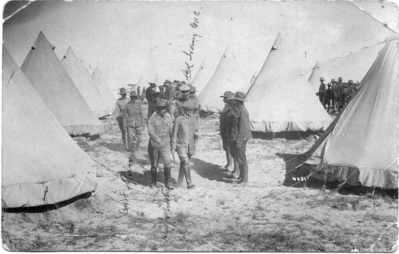B/W print. Three officers, including Capt. W.O. Mansbridge on the left, escorting a dignitary over rough, sandy ground between rows of round tents. Three soldiers appear to be standing by their tent, and there are two groups of men in the background.