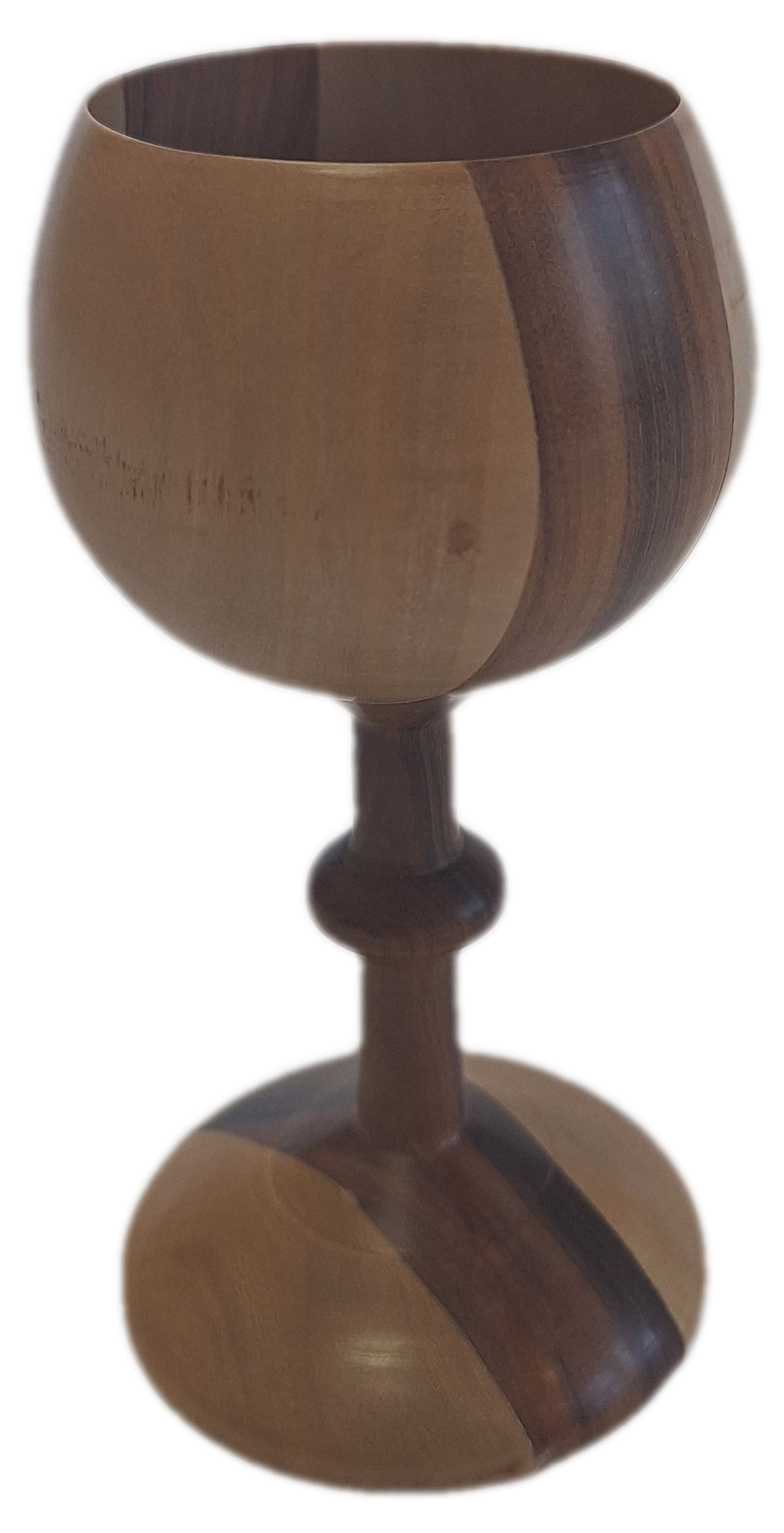 Wooden goblet with alternate light and dark wood colorings. Has a lightly colored ring around the base of the goblet and also inside the goblet.