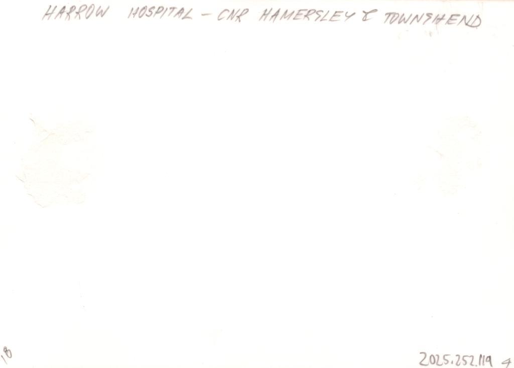 Reverse: Written on the reverse in pencil 'HARROW HOSPITAL - CNR HAMERSLEY & TOWNSHEND'