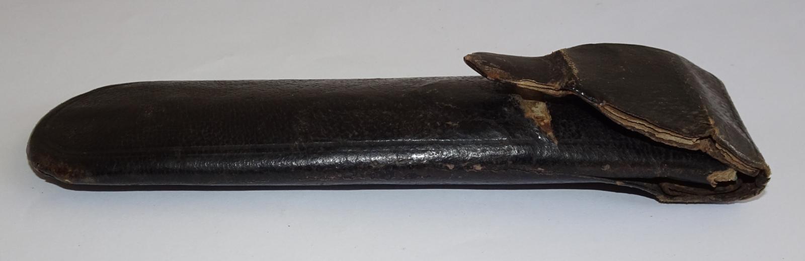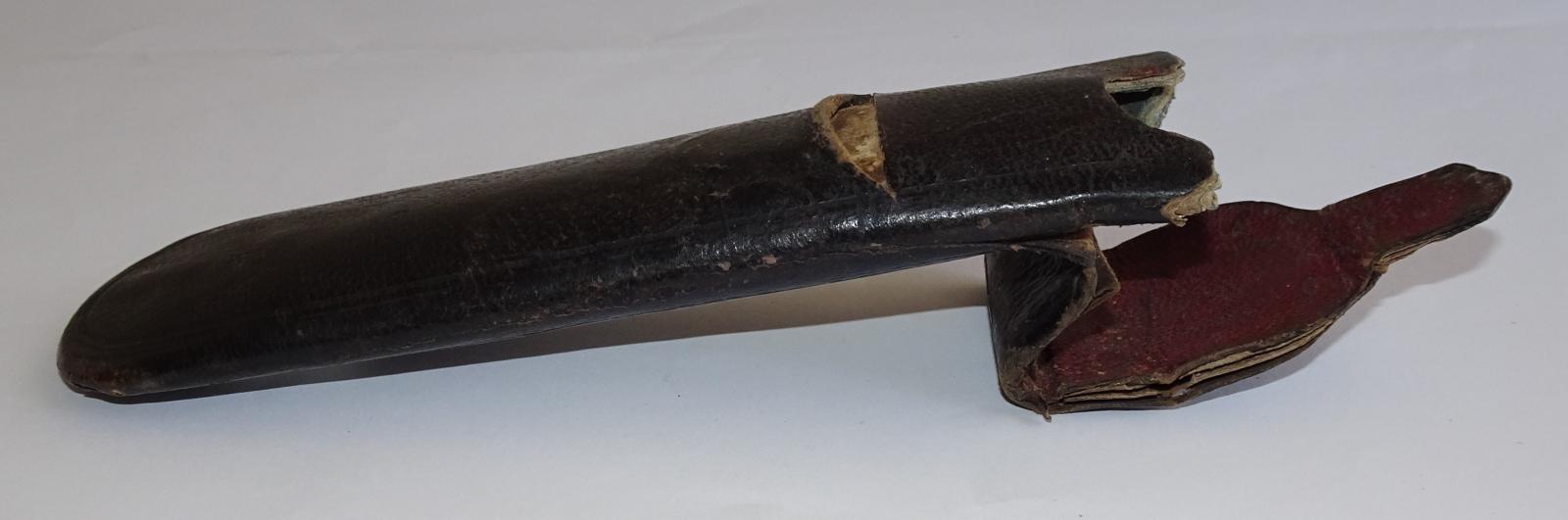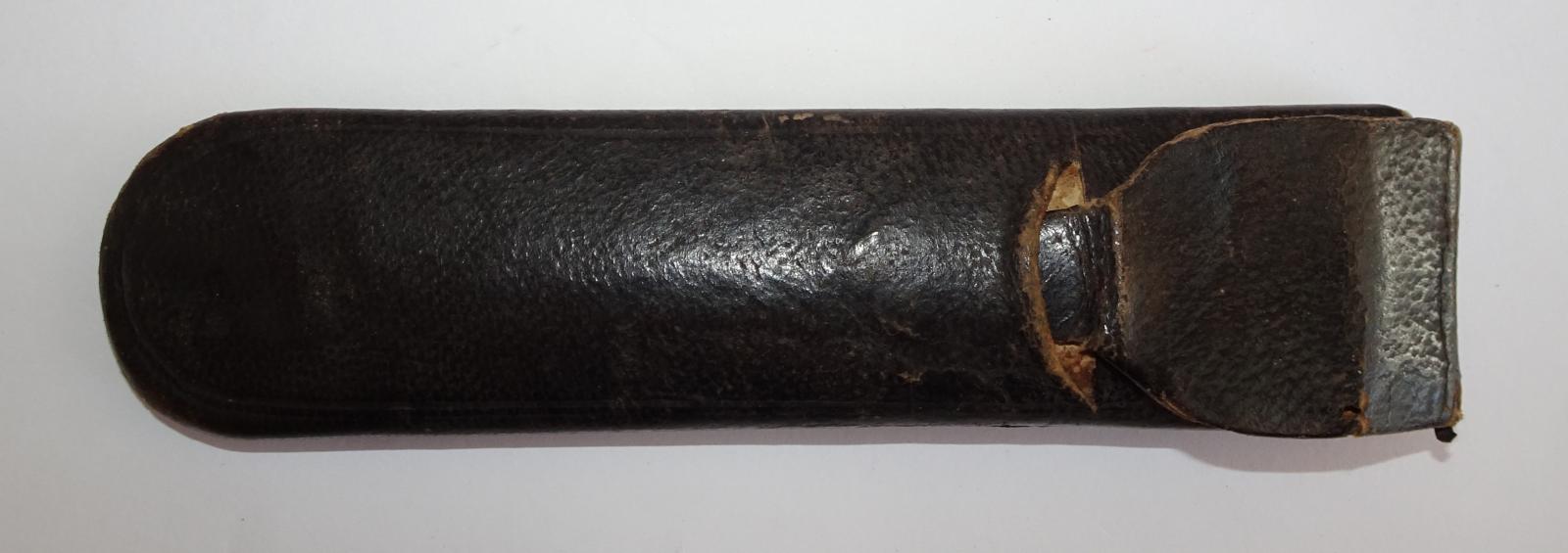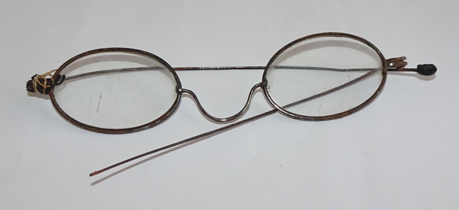 A set of spectacles mnade from thin wire frame and two glass oval pieces. One arm has been re-wired at the hinge and while one arm has a small stopper at the end of the wire, the other does not. The black leather case opens at the top and has a shaped flap that fits into a slit